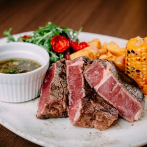 O cină gourmet cu recomandare de steak-uri maturate, servire cu apa inclusă